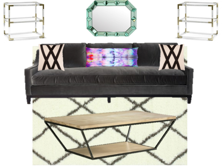 tie dye pillows (I love the color and femininity that this brings to the space) ::: sofa (the lines on this are just too good) ::: coffee table (this has an almost gem like shape and the wood brings in an organic element) ::: side table (maybe my favorite ever created) ::: mirror (the mint green color is just too perfect) ::: rug (love that the shape mimics the pillows!)