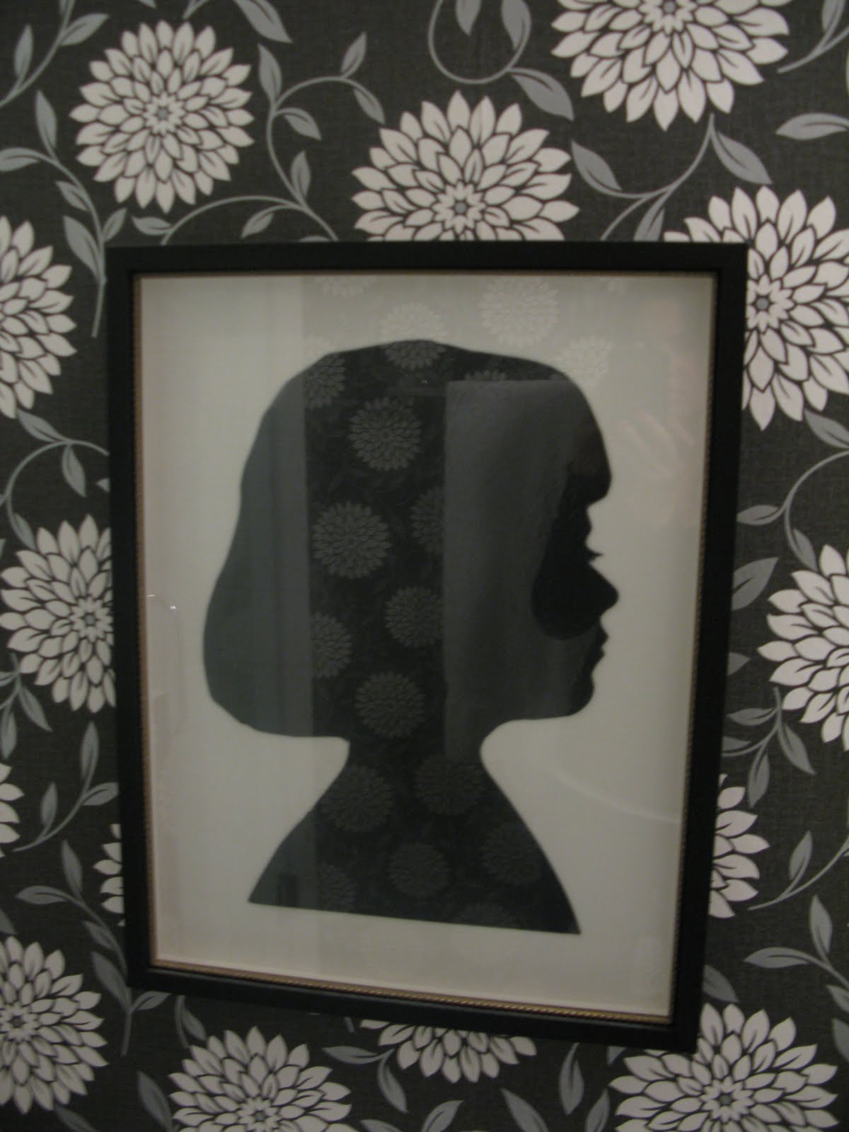 A silhouette that hangs in our guest bathroom. My grandma made this for my when I was 6 years old. When she moved out of her house last year, she found it and had it framed for me. I love it. Except… my hair???
