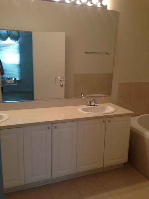 And now the after. We kept the vanity (it just needed a new coat of paint) and we kept the tub (but changed the surround and took the tile off the walls), everything else is new. Mirrors, lights, counter, floor, sink, faucets, shower floors/walls/bench and fixtures. There were a couple things we had to sacrifice (ie medicine cabinets because of the weird dimensions) but otherwise, its pretty damn perfect.