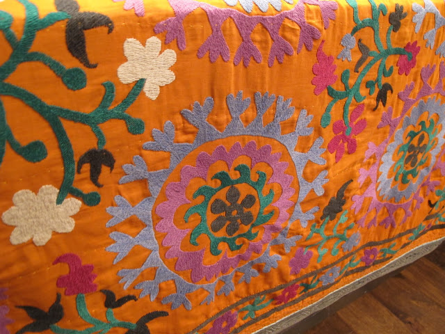 My favorite textile would probably have to be my latest Suzani purchase! It has a bright orange background and I am absolutely smitten with it’s colors and pattern! I feel like it adds life to every thing in the whole room. It always amazes me what a little color can do to liven and change things up.