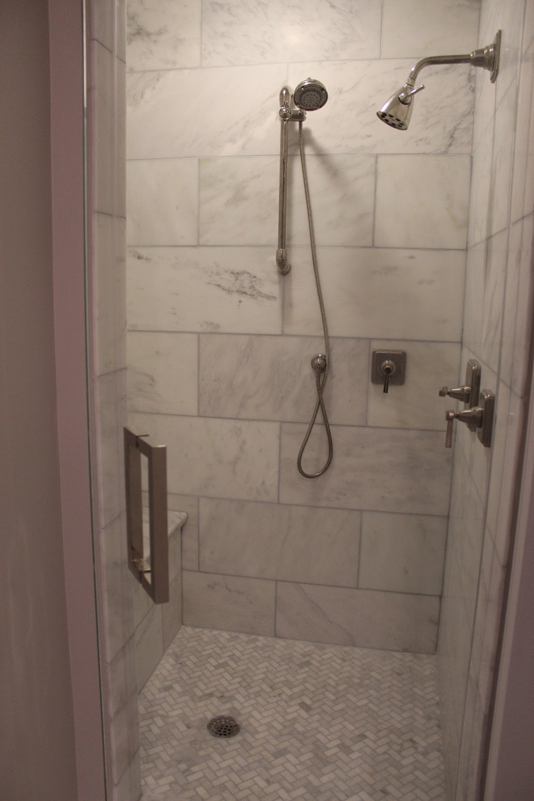 Our new shower. Its amazing how happy a new shower can make me. Absolutely love the mix of the large pieces on the walls and the herringbone floor.