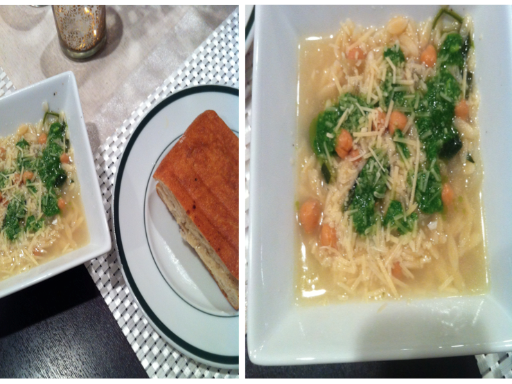 Directions: Preheat a large pan. Drizzle with olive oil. Add onions and saute until tender. Add garlic and saute for 2 – 3 minutes. Add zucchini, spinach, oregano, salt and pepper, chicken or vegetable stock and water. Bring to a boil and reduce heat to medium. Add orzo cook for 12 – 15 minutes, or until orzo is tender. Add garbanzo beans at the end, cook until they are tender. They can become mushy easily.