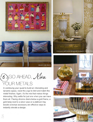 In the article she gives lots of amazing advice and tips. Christine also shared pictures on how to accomplish these things. She was sweet enough to ask for a picture from my home to demonstrate one of these rules. Shown here is the mixing of metals on my side table (middle left)