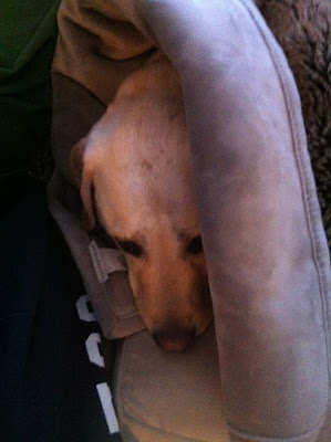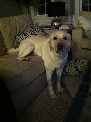 The shaved dog can’t decide if he should be on or off the sofa. Check out those poodle arms. Awkward. |
