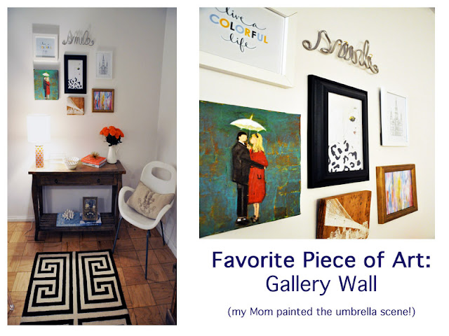 The one thing I knew I wanted in my apartment was a gallery wall. I found myself daydreaming about what prints to include, and how to arrange them. Confession: I just hung it up this weekend! Better late than never, right? I love the mix of prints — including a special piece my Mom painted. I anchored the wall around a Leigh Viner print — she’s SO talented. I also have a print by Alaina, a local Brooklyn Artist (not sure who since I bought it at the flea market), and Nicole Cohen.