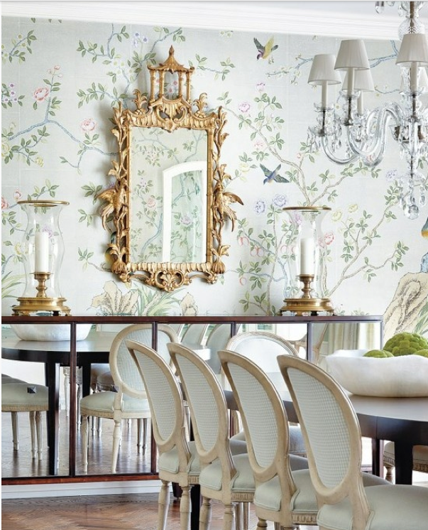 Oh man I just love chinoiserie in a dining room. It adds a nice level of formality and whimsy at the same time. Then, again, not totally sure I see it with those chairs. The chairs are damn sexy, though!