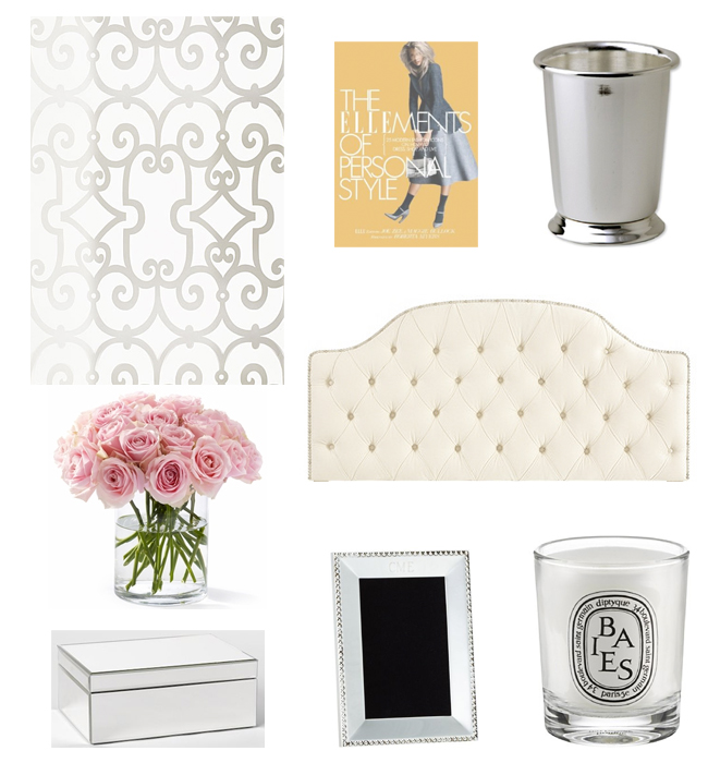 mirrored box ::: pink roses ::: silver julep cup ::: Schumacher wallpaper (email me for order info) ::: gold hardcover Elle book :::my favorite candle in a mini version ::: silver picture frame  ::: tufted headboard