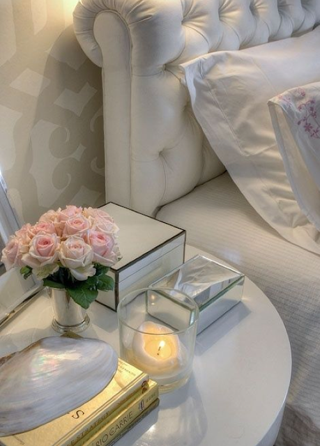 I love this little bedroom vignette. It’s feminine, soft, glam, and neutral with just the right amount of romance