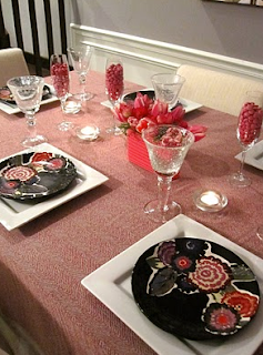 Here is my Valentine’s Day dinner table draped in a pink, sheer, herringbone fabric I got for $7.