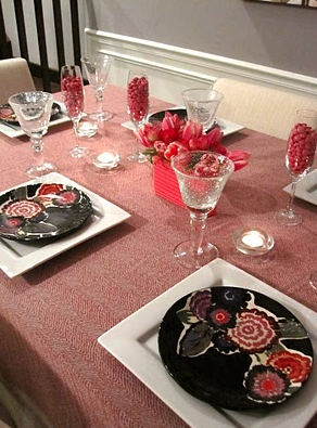 Here is my Valentine’s Day dinner table draped in a pink, sheer, herringbone fabric I got for $7.