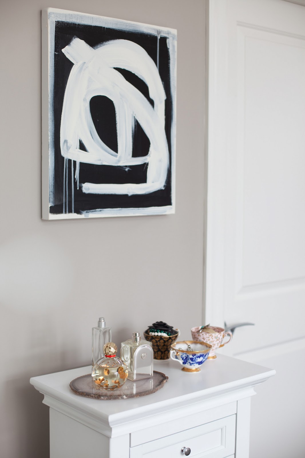 Black and white abstract is by Jenny Andrew (yeah you know her from MFAMB, but shes also an insane artist). Teacups were my grandmas. Other sources: Quartz tray,  my favorite Twirl perfume, and my jewelry armoire