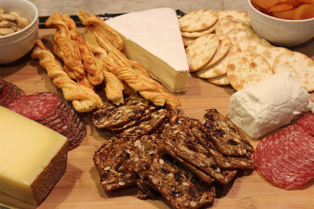 (peppered salami, rosemary maracona almonds, cheese sticks, gruyere, brie, goat cheese, water crackers, non-peppered salami, dried apricots, and date and sea salt crackers. YUM)