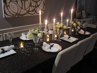 The table cloth was a really disgusting sequin fabric that I bought the day before. I ended up using the back of the fabric since it was a little less aggressive- black with a gold shimmer. Turned out perfectly.