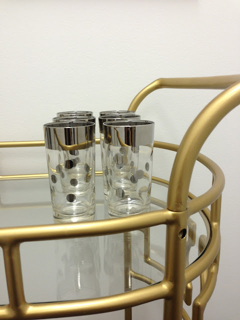 I am quite jealous of those beautiful vintage glasses on that bar cart!