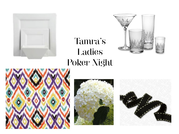 Tamra has these beautiful white ceramic plates, and crystal barware that are the basis of the setting. From there we just added in some simple details! Since the ladies are having poker night, before they play, I would drape that gorgeous (and cheap) ikat fabric over the table to disguise the poker top! I also love how it has green and black it in so it sort of gives a nod to the card game. Next I would do a nice low vase of white hyragenas. Since theres so much going on with the table cloth you want your flowers nice and simple! To add a little extra something, it would be great to wrap the glass vase in this gorgeous black and white stitched ribbon