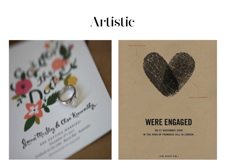 2. Those are all great options. I really depends on how your overall wedding theme/experience will be, so it will tie together. But if i was just picking out from the options you have above, my favorite is the artistic and possibly the item. All are cute, but which would work best your overall look?