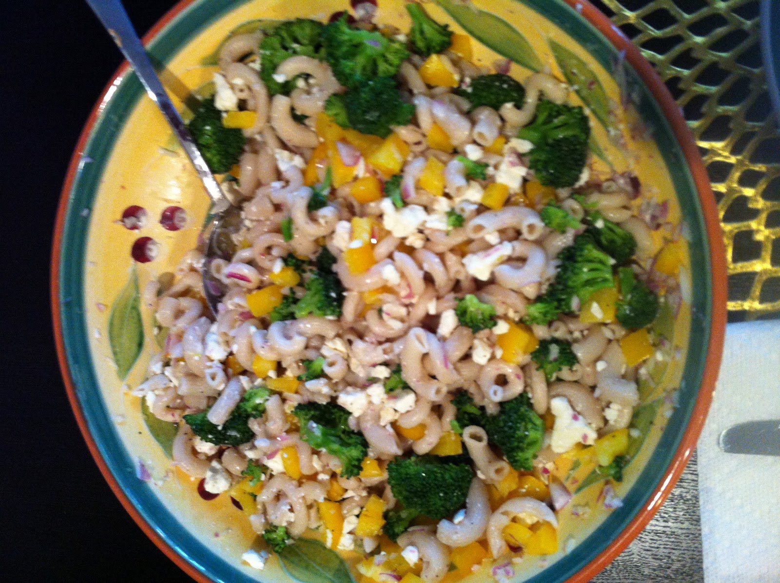 Made this delicious summer pasta salad (broccoli, peppers, red onion, feta and a really light dressing with brown rice pasta = delish)
