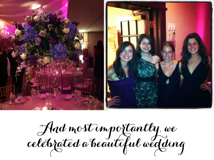And for the dresses… it was too much fun being borrow from “the closet”. I wore a gorgeous Elie Saab gown with an open back almost all the way down to my booty. Amazing. And my friend Laura (in the one shoulder lace) wore Valentino. Our friend (next to me) who helped this all happen wore Dior. And of course, on the far left, the sister of the groom, the reason we were all there!!