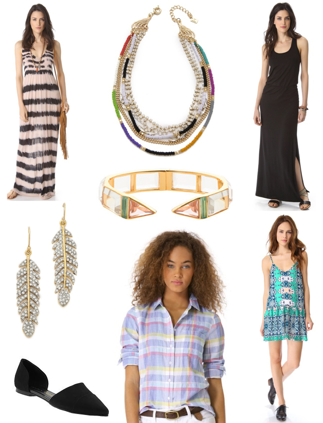 Tie-dye maxi ::: Green tank dress ::: Feather earrings ::: Colorful beaded necklace ::: Pastel plaid shirt ::: Black cotton maxi (I’ve been living in this) ::: Jennifer Meyer Cuff ::: Jenni Kayne Knock-Offs (I haven’t taken mine off since they came and SUCH a good price)