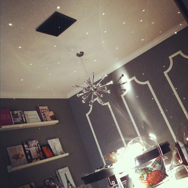 My current favorite room is my Dining Room. While rarely used it holds some of my favorite things. My beautiful books, my gorgeous ghost chairs, and the moulding I had put on the wall.
