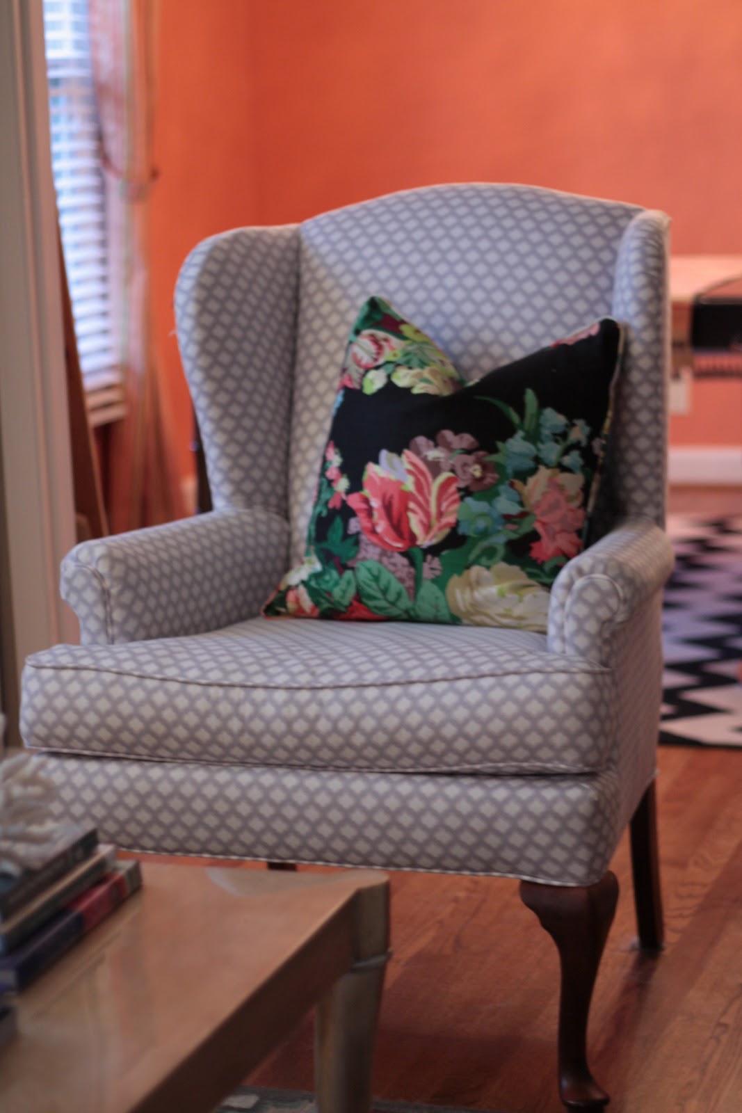 My favorite textiles are in my formal living room.  I had a pair of my mom’s old wing back chairs recovered at Furbish.  The floral pillows are my favorite fabric of all time.