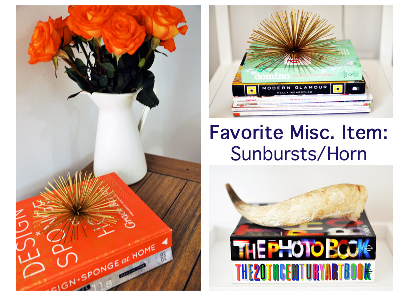 My favorite miscellaneous items are actually two — sorry, I couldn’t pick! The first are the Zhush sunbursts that I bought in all three sizes in. They are meant to be hung on a wall, but I found they were much happier as book toppers. They are one of my favorite purchases, and they are very well priced too! The horn is a super random thing I picked up at the Brooklyn Flea market this summer. I just love how rustic it is.